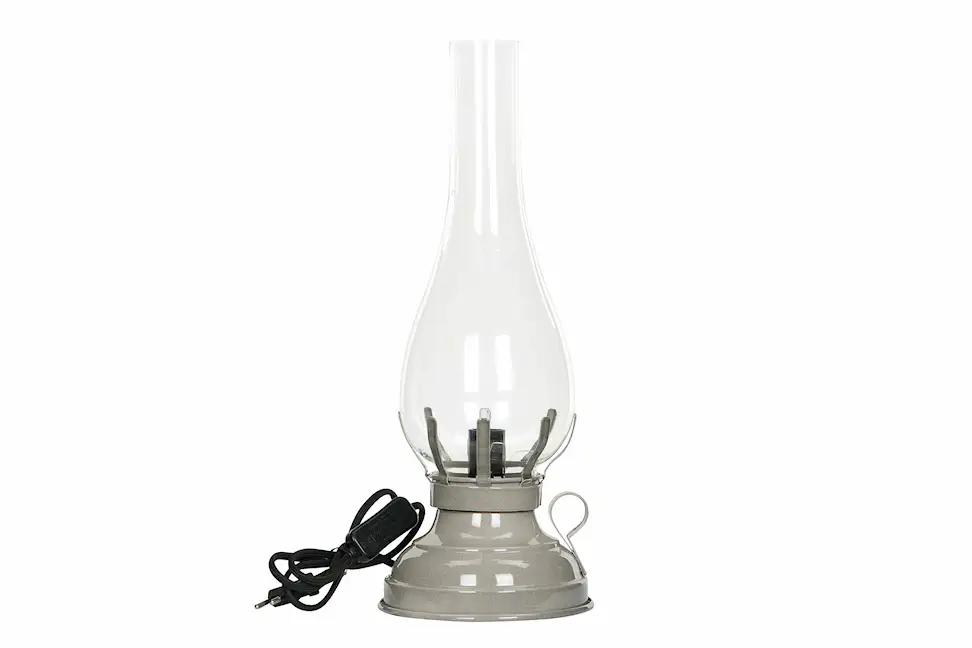 Vacker bordslampa i stilen av en fotogenlampa. Tillverkad av metall med lampskärm i glas. Ger inredningen en härlig vintagekänsla. Finns i flera färger.