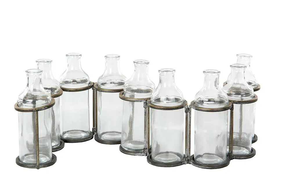 Detta ställ med fyra flaskor är en fin dekoration som är perfekt att ställa snittblommor i. Tillverkat i glas och metall. Finns i flera storlekar.