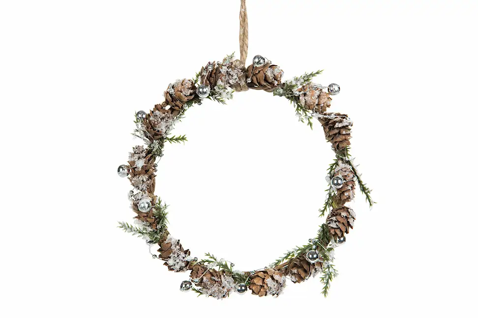 Krans med kottar och konstsnö som blir en fin dekoration under vintertider. Tillverkad i naturmaterial, metall och plast.