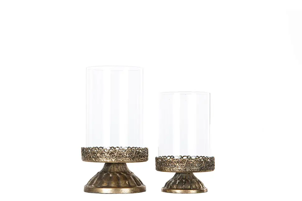 Set om två ljuslyktor med cylinderformat glas på en elegant metallfot. Perfekt när man vill dekorera med levande ljus.
