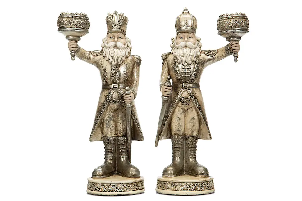 Set med två nötknäppare i hatt och frack som håller en fackla i varsin hand, där ljushållarna finns. En charmig och lekfull inredningsdetalj. Tillverkad i poly. Finns i flera färger.