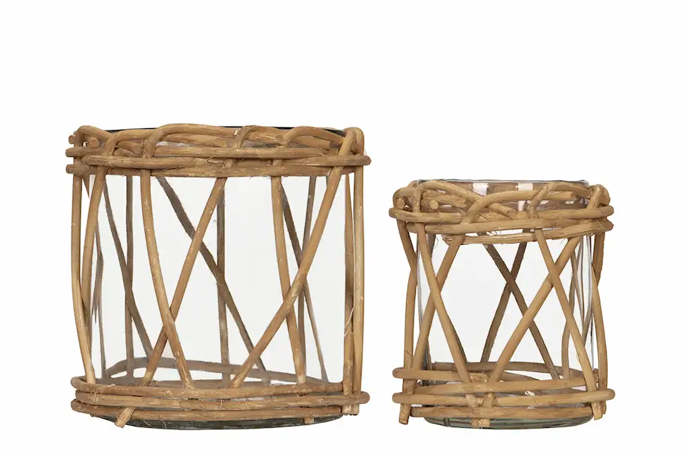 Detta set med två lyktor är inspirerat av naturen och gett mysigt sken av levande ljus. Tillverkade i rotting och glas.