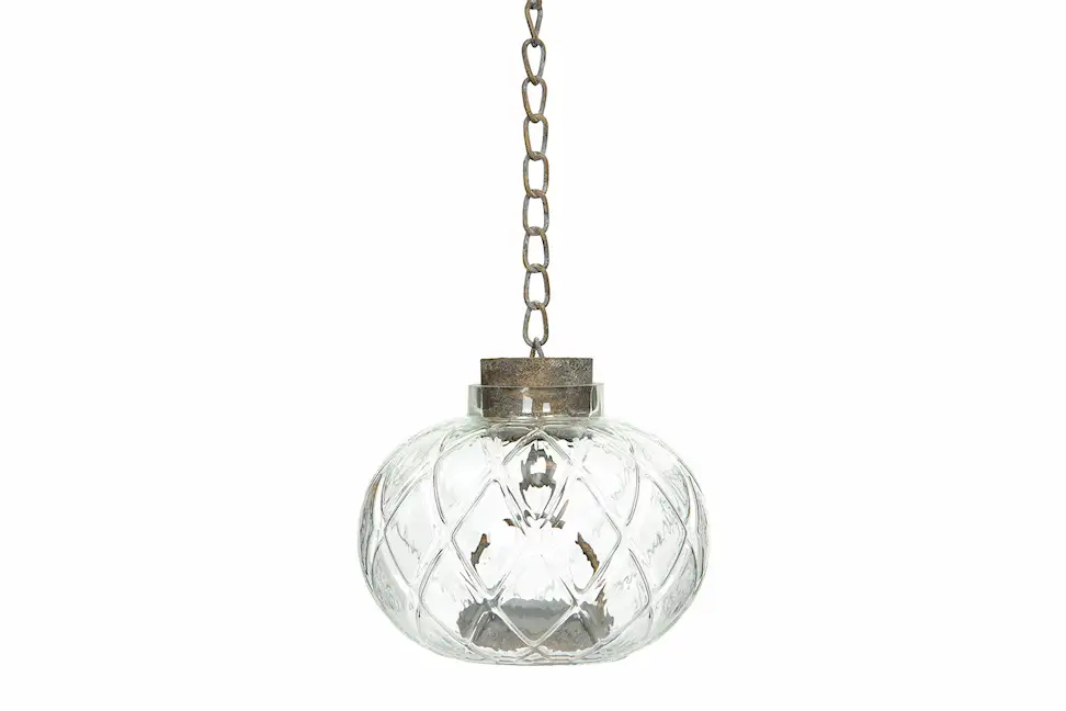 Rund glaslykta som hänger i en kedja. Perfekt för dig som vill lysa upp uteplatsen. Tillverkad i glas och metall.