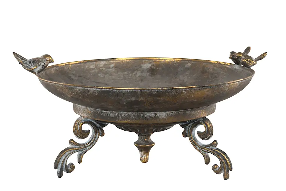 Ett vackert fat på tre ben med dekorativa små fåglar på kanten. Passar lika bra som fågelbad som till växter eller ljus. Tillverkat i metall.